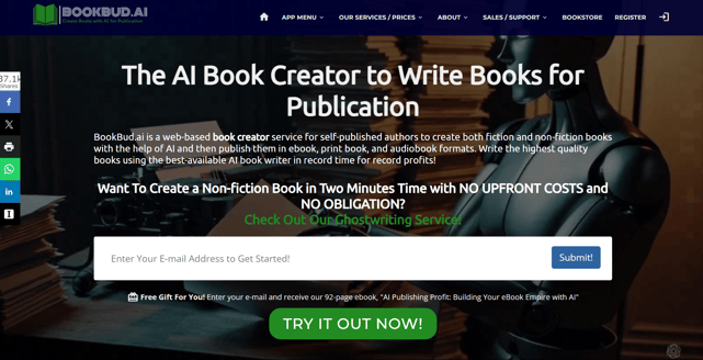 BookBud.ai is an AI-powered self-publishing platform that streamlines the creation and distribution of high-quality fiction and nonfiction books. It enables authors to produce ebooks, print books, and audiobooks quickly and affordably, offering features like rapid book creation, global distribution, and multi-format publishing. By utilizing advanced AI writing tools, BookBud.ai makes self-publishing accessible and cost-effective for both aspiring and established authors.