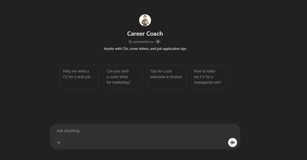 Career Coach is a tool created by promptish.co that helps users with CV writing, cover letter drafting, and job application tips. It features a clean and intuitive interface where users can ask questions or select from suggested prompts like writing a CV for a tech job, drafting a cover letter for marketing, preparing for finance interviews, or tailoring a CV for a managerial role. The tool is designed to guide job seekers through various stages of the job application process with personalized support.
